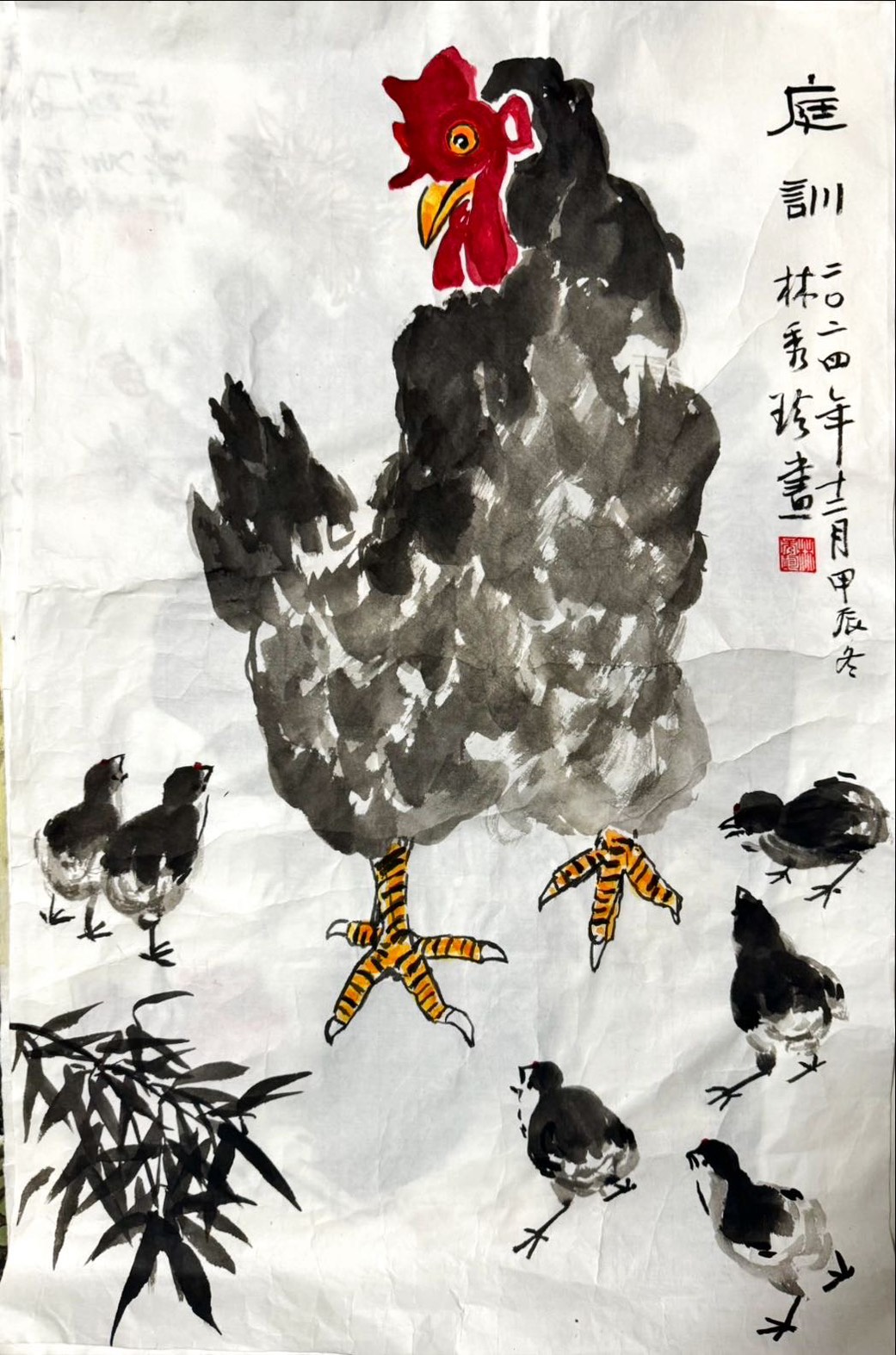 一隻母雞圍繞著數隻小雞,似在傳授生活之道,畫面溫馨生動。墨筆寫意帶出趣味與生活感,象徵家庭教育與愛的傳承。
