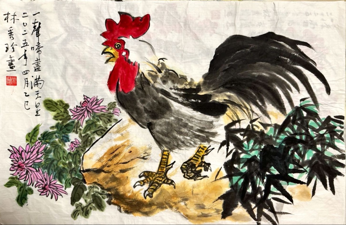 《報曉迎春》以雄雞為主角,象徵堅毅自信與吉祥如意。畫中雄雞昂首啼鳴,羽毛鮮亮、姿態生動,展現出勃勃生機與喜氣氛圍。背景以竹葉象徵堅韌、菊花代表高潔,整體構圖寓意深遠,傳達出迎春報喜、萬象更新的美好祝願。