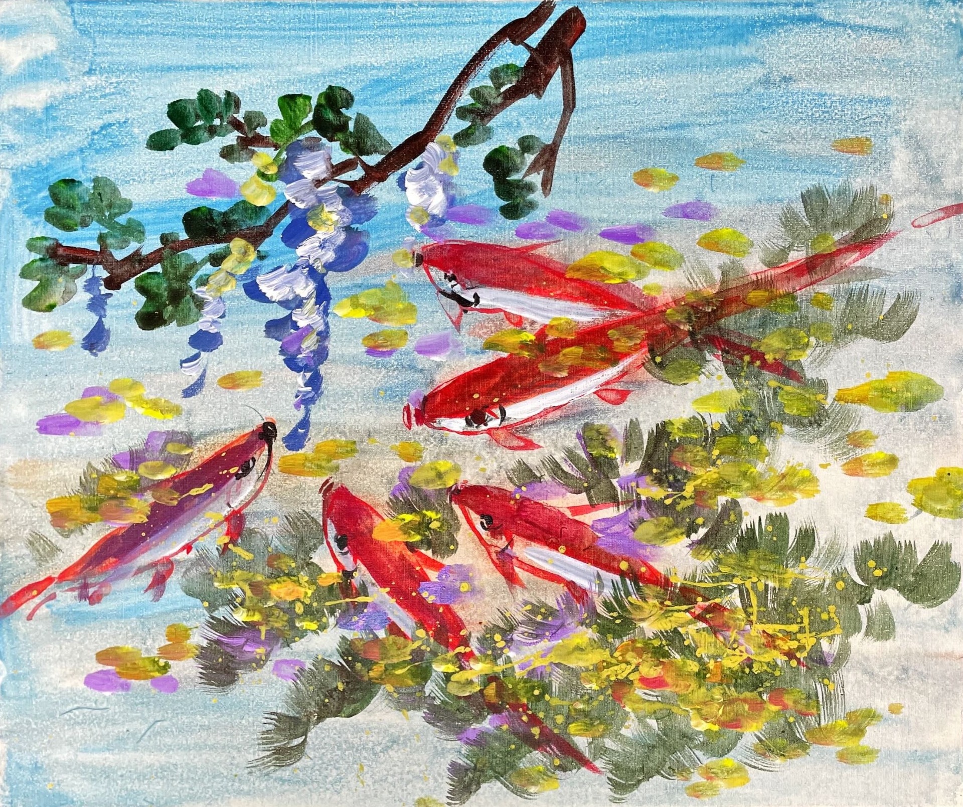 這幅色彩繽紛的畫作以藍天為背景,展示了幾條鮮紅的錦鯉在清澈的水中悠游,周圍點綴著黃色、紫色的小花瓣,營造出一種平靜且充滿生氣的氛圍。上方的紫藤花垂掛而下,增添了一絲雅致之美。畫中的錦鯉象徵著吉祥、長壽和成功,與紫藤的優雅交相輝映,形成一幅生機勃勃的景象。