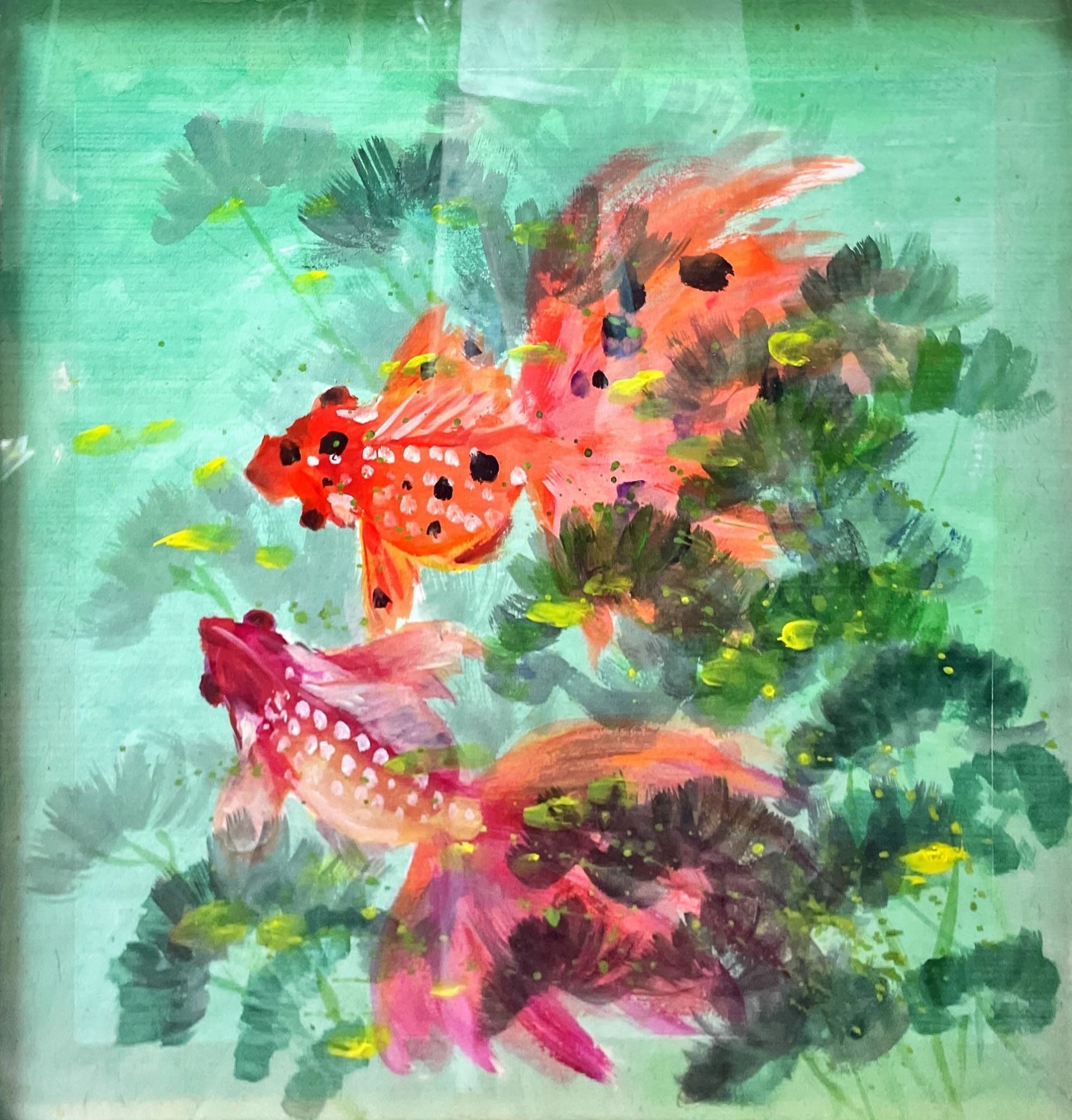 此作品以雙魚為主題,展現出水中生物的悠遊與和諧。兩條魚共游在水中,代表雙魚座對自由和靈動的嚮往,同時也展現了他們天生的共融精神。畫作傳達出一種寧靜而和諧的氛圍,讓人聯想到雙魚座溫柔、富有同理心的一面。這幅作品適合喜愛自然與和平氛圍的觀者。